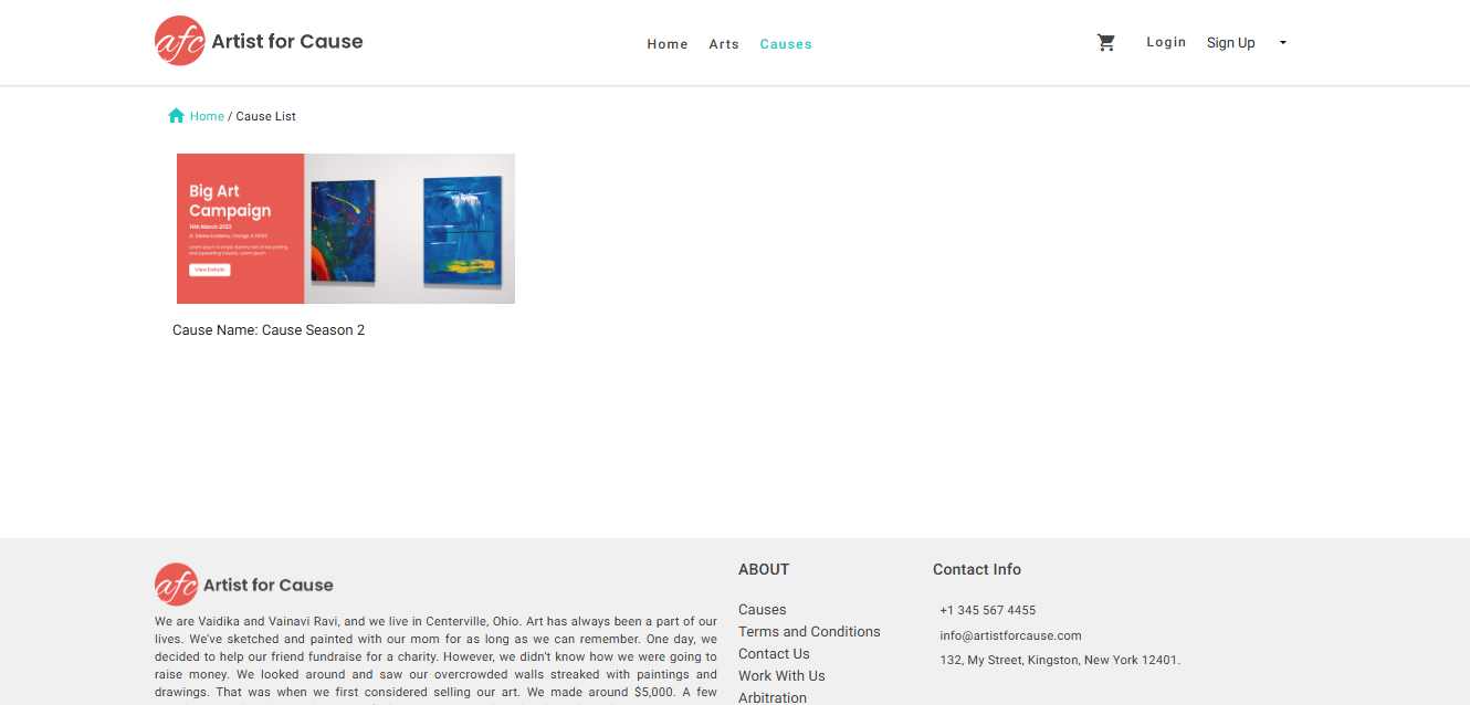 Art for a Cause is a nonprofit website developed to provide a platform for artists to showcase and sell their artwork while supporting charitable causes. The idea was initiated by Vaidika and Vainavi Ravi, two young artists from Centerville, Ohio, who wanted to use their creativity to help others. The platform allows artists to display their work, choose to donate proceeds to various charities, and connect with a community of like-minded individuals. This project highlights how art and technology can come together to inspire positive change and make a meaningful impact worldwide.