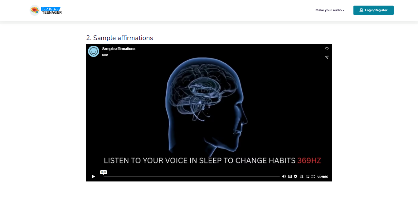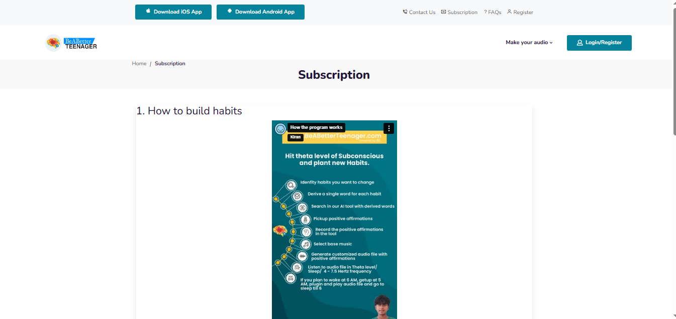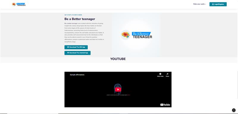 Be a better teenager was created with the intention of giving insight into various deep topics like how habits are formed from early stages of life, power of mind, levels of Subconscious, accessing theta level of subconscious, neuroplasticity, unlearn the old habits and plant new habits. It also provides self-assessment tool to the individuals so that they can be able to search in our AI tool for positive affirmations, prepare customized audio and listen to it while in sleep/theta stage.