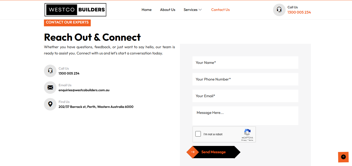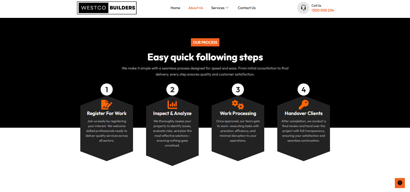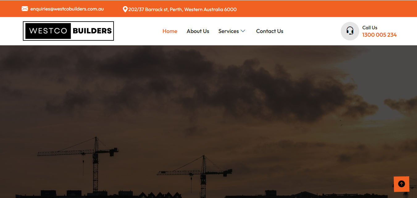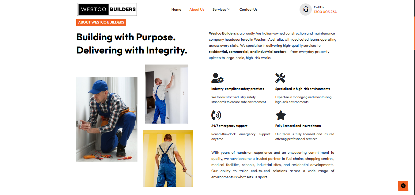 Westco Builders – Static Webpage Design We created the static website for Westco Builders, an Australian-owned construction and maintenance company serving residential, commercial, and industrial sectors across the nation. The design showcases their expertise, reliability, and wide-ranging capabilities — from property maintenance to large-scale construction projects. The site was built with a professional layout, responsive structure, and clear content flow to reflect Westco Builders’ commitment to quality and excellence.